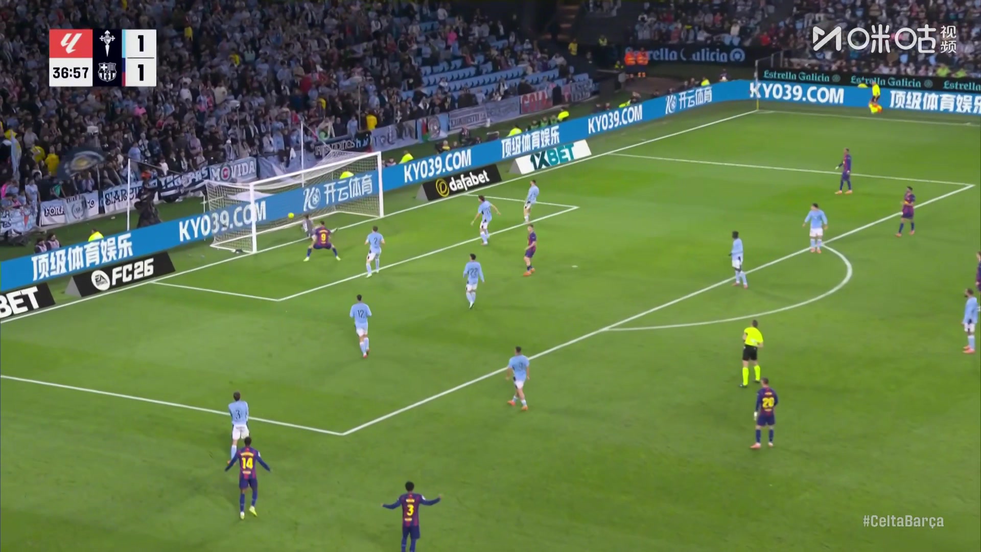 巴萨被扳平!拉什福德失单刀,随后塞尔塔反击破门
